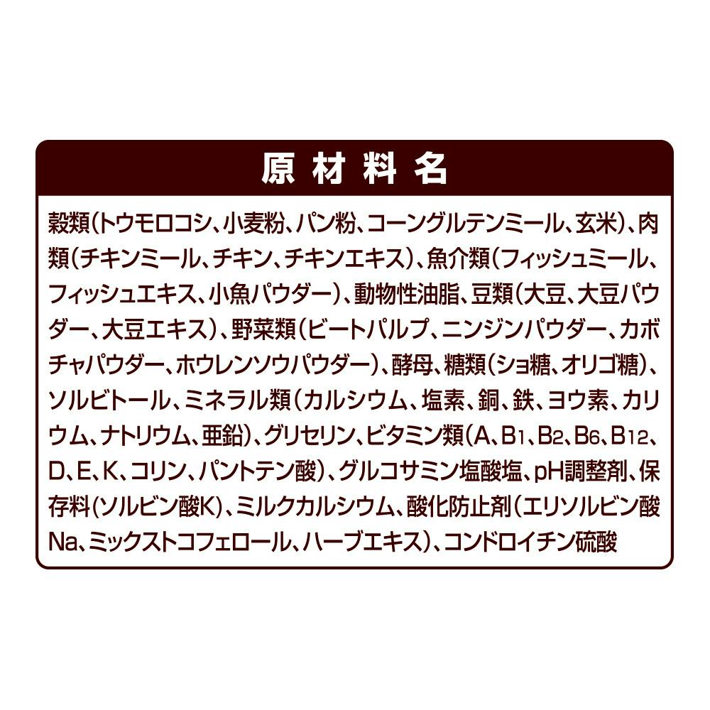 たんぱく質20.0%以上、脂質9.0%以上、粗繊維4.5%以下、灰分8.5%以下、水分12.0%以下