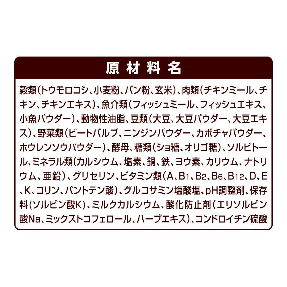 たんぱく質18.0%以上、脂質9.0%以上、粗繊維4.5%以下、灰分8.5%以下、水分12.0%以下