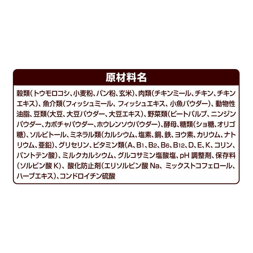 穀類(トウモロコシ、小麦粉、パン粉、玄米)、肉類(チキンミール、チキン、チキンエキス)、魚介類(フィッシュミール、フィッシュエキス、小魚パウダー)、動物性油脂、豆類(大豆、大豆パウダー、大豆エキス)、野菜類(ビートパルプ、ニンジンパウダー、カボチャパウダー、ホウレンソウパウダー)、酵母、糖類(ショ糖、オリゴ糖)、ソルビトール、ミネラル類、グリセリン、ビタミン類、ミルクカルシウム、グルコサミン塩酸塩、pH調整剤、保存料、酸化防止剤、コンドロイチン硫酸