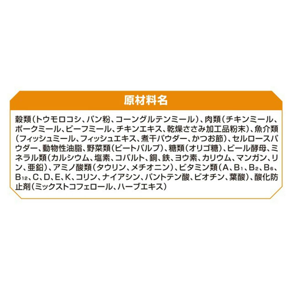 たんぱく質30.0%以上、脂質9.0%以上、粗繊維9.0%以下、灰分7.0%以下、水分10.0%以下