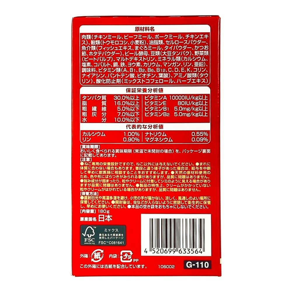 たんぱく質30.0%以上、脂質16.0%以上、粗繊維5.0%以下、灰分7.0%以下、水分10.0%以下