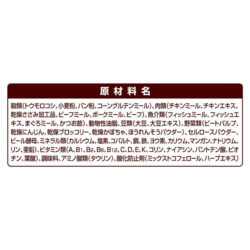 たんぱく質22.0%以上、脂質11.5%以上、粗繊維4.5%以下、灰分8.5%以下、水分10.0%以下