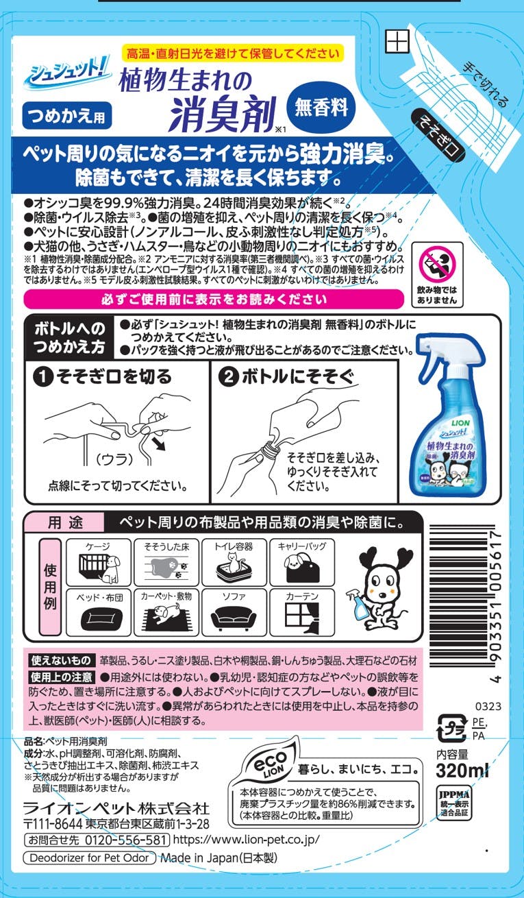 【ケース販売】ライオンペットLION シュシュット! 植物生まれの消臭剤 無香料 320ml つめかえ用(1ケース24個入り)3670468024 【別送品】