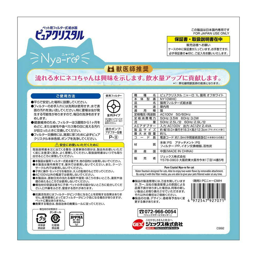 【ケース販売】GEX ピュアクリスタル 猫用フィルター式給水器 ニャーロ 1L オフホワイト(1ケース8個入り) 3740644008【別送品】