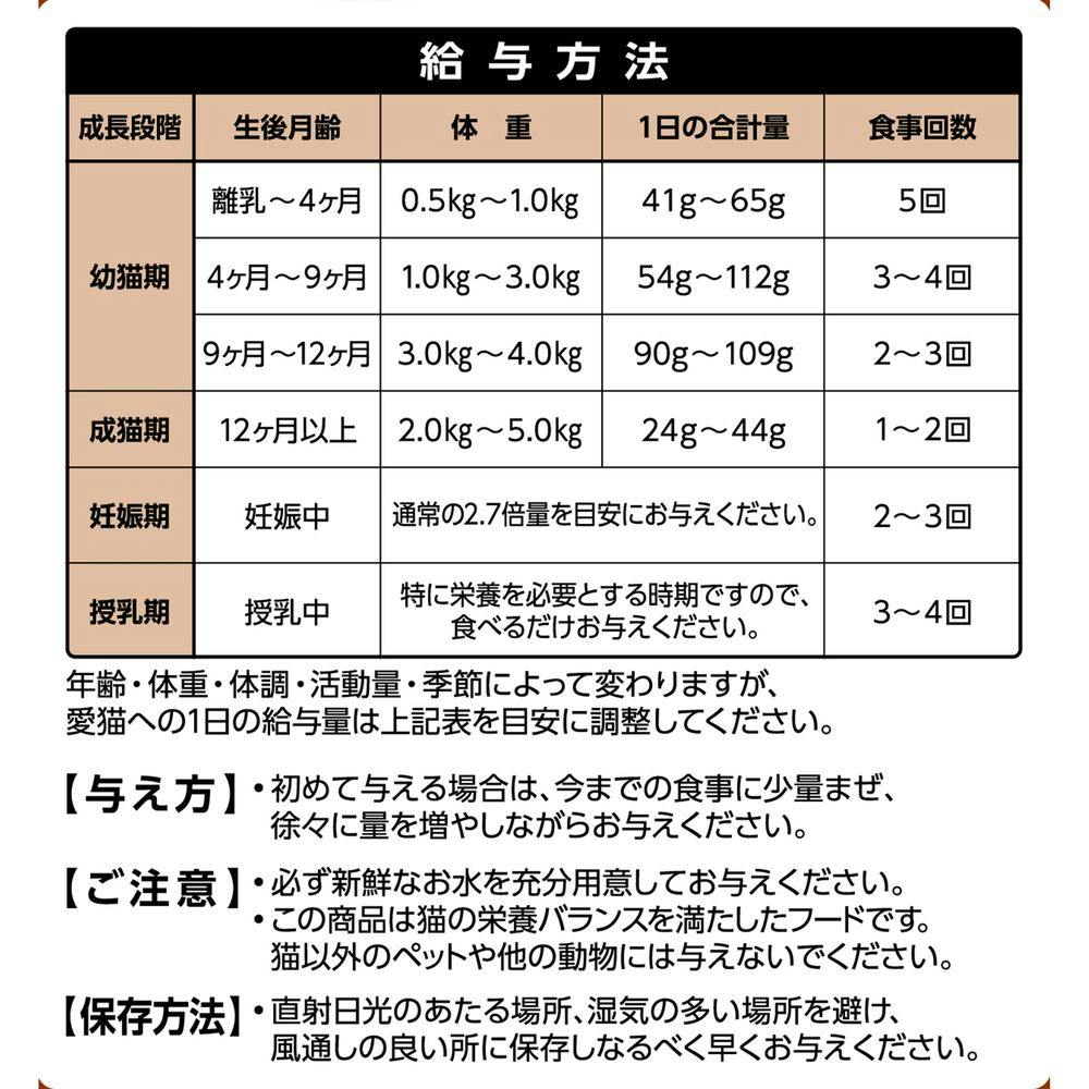 たんぱく質30.0%以上、脂質12.0%以上、粗繊維3.0%以下、灰分9.0%以下、水分10.0%以下