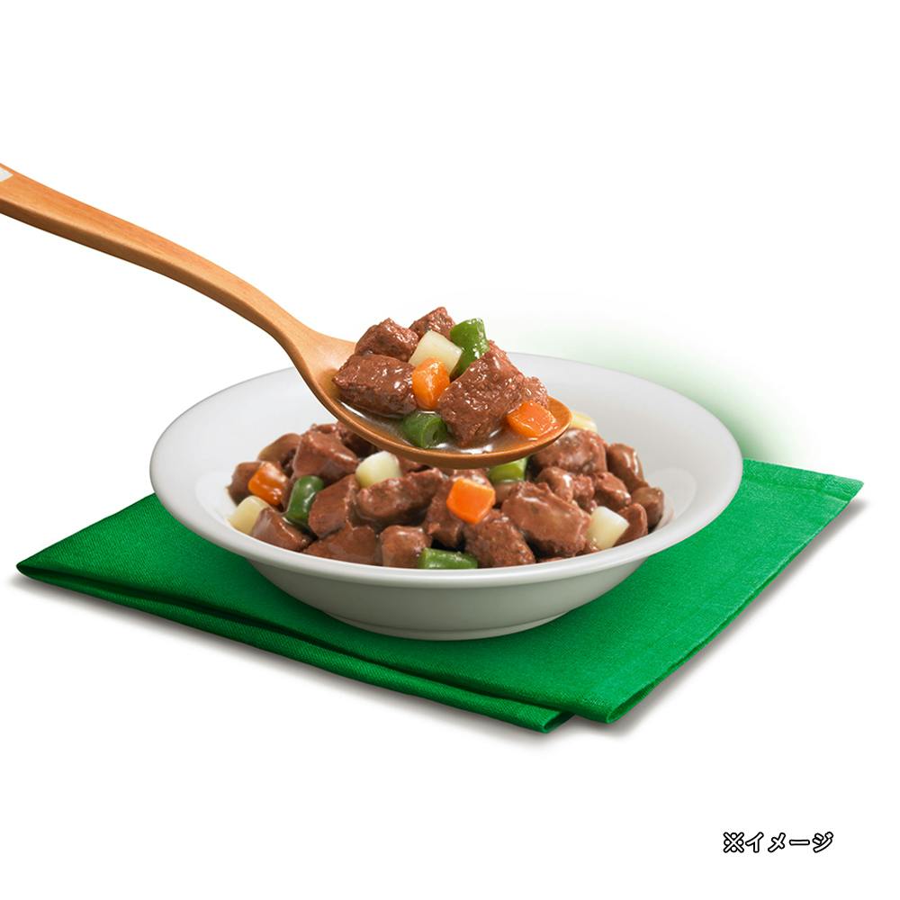 肉類(チキン、ビーフ等)、小麦グルテン、野菜類(にんじん、いんげん)、ビートパルプ、じゃがいも、大豆油、ビタミン類(B1、B2、B6、B12、C、D3、E、K、コリン、ナイアシン、パントテン酸、ビオチン、葉酸)、ミネラル類(Ca、Cl、Cu、I、K、Mg、Mn、Na、Se、Zn)、増粘安定剤(加工でん粉、増粘多糖類)、リン酸塩、着色料(カラメル、酸化鉄)、EDTA-Na、発色剤(亜硝酸Na)