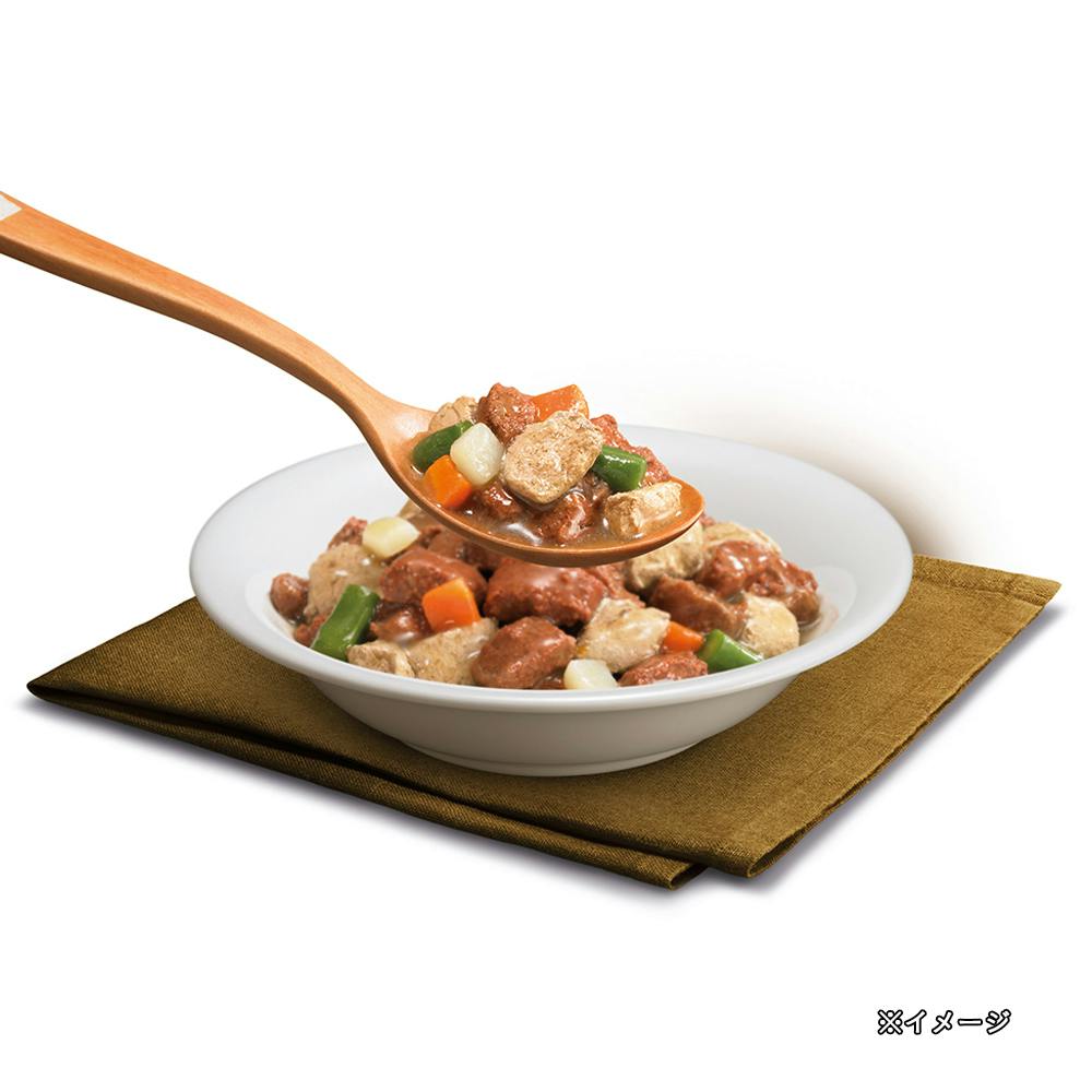 肉類(チキン、ビーフ、鶏レバー等)、小麦グルテン、野菜類(にんじん、いんげん)、ビートパルプ、じゃがいも、大豆油、ビタミン類(B1、B2、B6、B12、C、D3、E、K、コリン、ナイアシン、パントテン酸、ビオチン、葉酸)、ミネラル類(Ca、Cl、Cu、I、K、Mg、Mn、Na、Se、Zn)、増粘安定剤(加工でん粉、増粘多糖類)、リン酸塩、着色料(カラメル、酸化鉄)、EDTA-Na