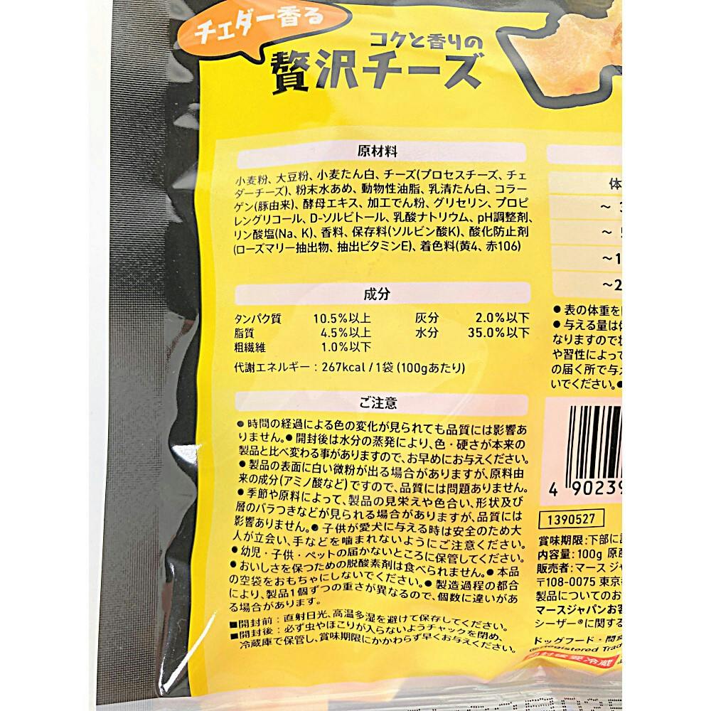 小麦粉、大豆粉、小麦たん白、プロセスチーズ(チェダーチーズ含む)、粉末水あめ、動物性油脂、乳清たん白、コラーゲン(豚由来)、酵母エキス、加工でん粉、グリセリン、プロピレングリコール、D-ソルビトール、乳酸ナトリウム、pH調整剤、リン酸塩(Na、K)、香料、保存料(ソルビン酸K)、酸化防止剤(ローズマリー抽出物、抽出ビタミンE)、着色料(黄4、赤40)