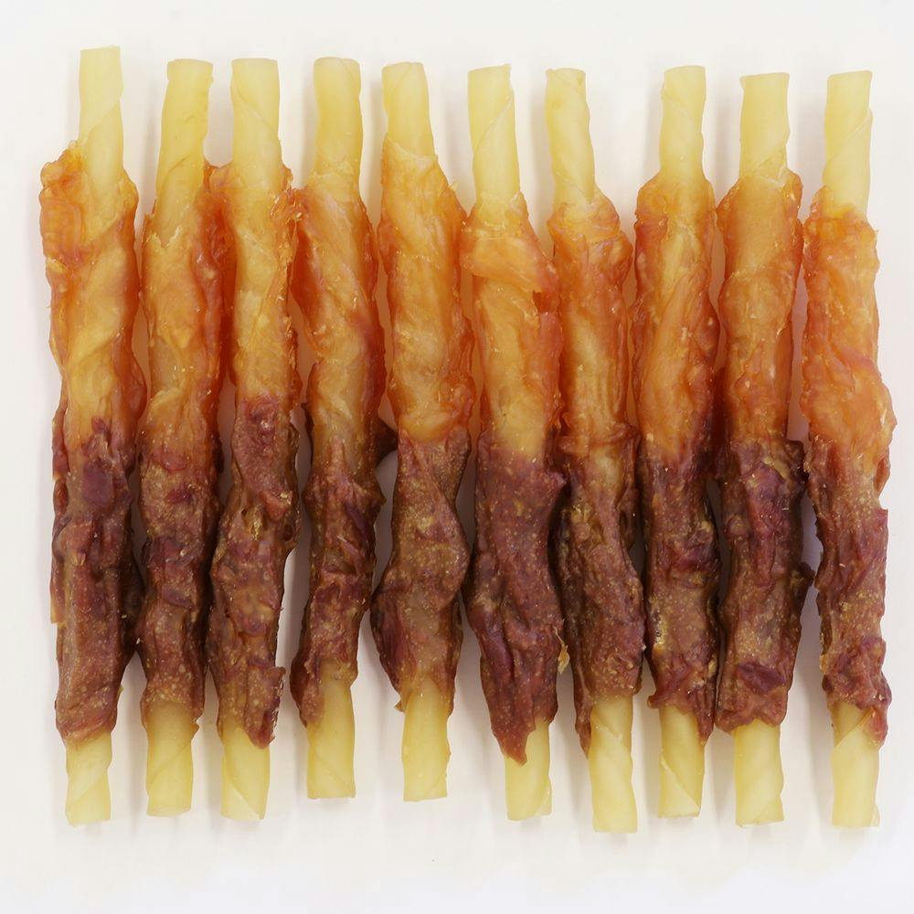 旨味たっぷりで低脂肪な鶏ササミと、鉄分が豊富で味わい深い砂ぎもを噛みごたえ抜群で最後までおいしい牛皮入りガムに巻きました。ダブルの素材とガムのおいしさが一度に味わえるスナックです。保存料・着色料不使用。便利な2袋分包。