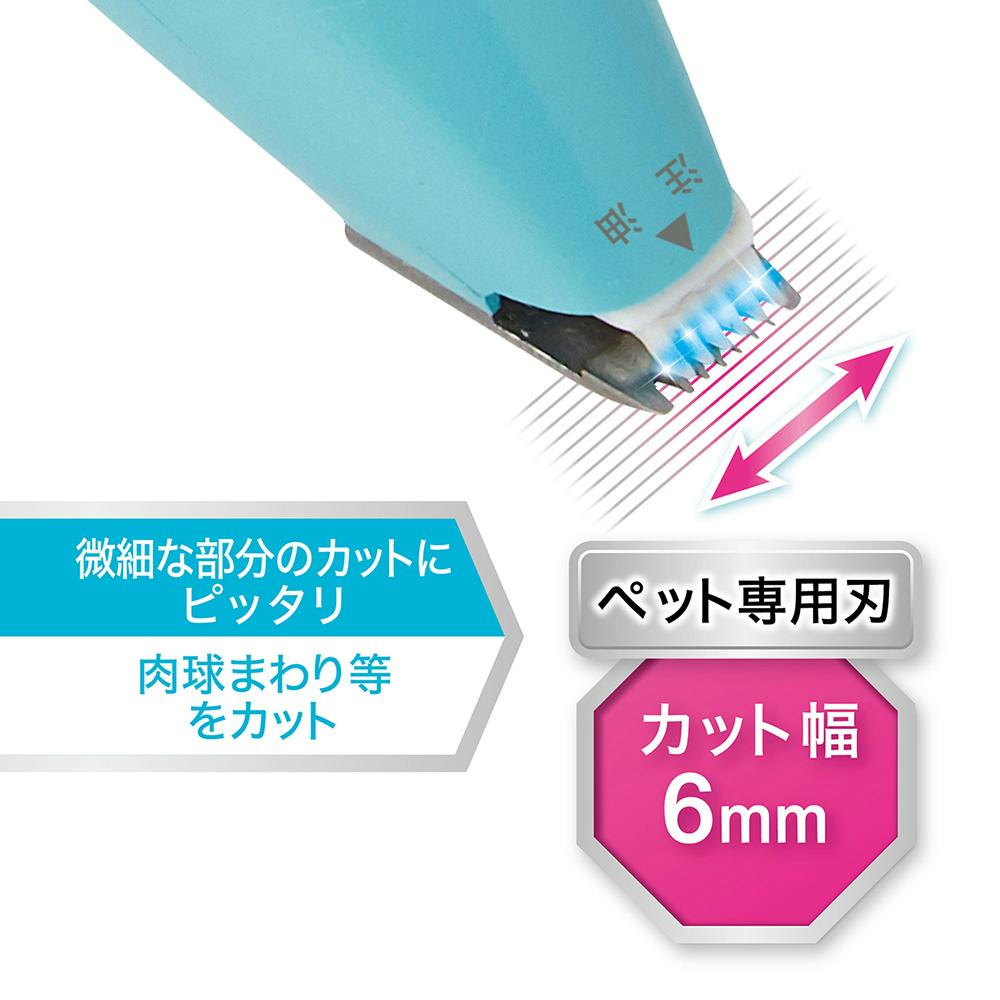 被毛をカットしてスッキリ・清潔・安心。微細な部分のカットにピッタリなサイズ、肉球まわり等をカット。カット幅6mm。フローリングで滑りやすい肉球まわりに・こまかい部分を整えたい時に。USB充電式。
