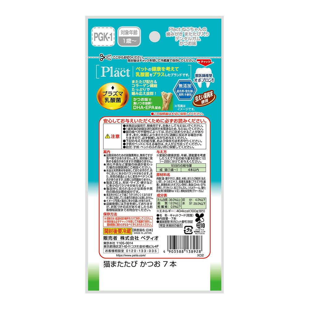 Plactはペットの健康を考えて乳酸菌をプラスしたブランドです。またたび入りのデンタルガムを噛むことで豚皮のコラーゲン繊維が歯垢をからめて落とします。かつお味で食いつき抜群!着色料・発色剤・香料無添加。