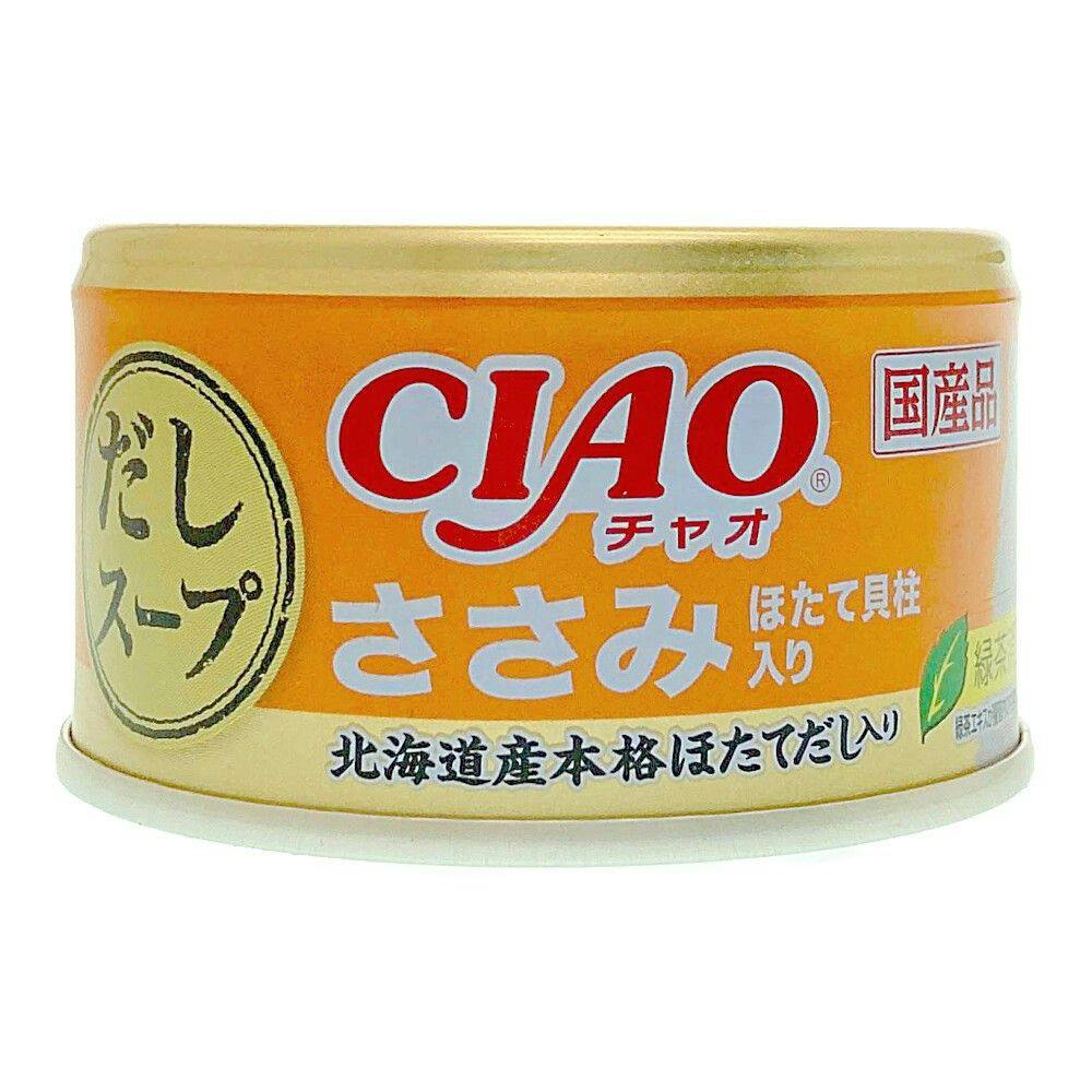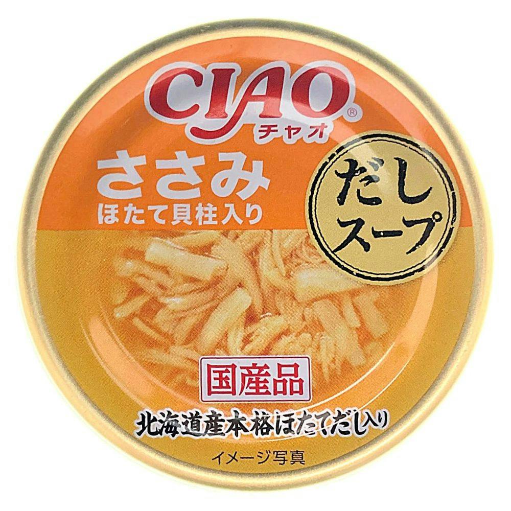 好評のCIAO缶のだしスープシリーズです。ささみの細かめフレークに猫ちゃんの喜ぶ素材をトッピングしました。たっぷりのスープで仕上げており、スープ好きな猫ちゃんも大満足です。北海道産の本格ほたてだしを使用し、風味豊かに仕上げました。