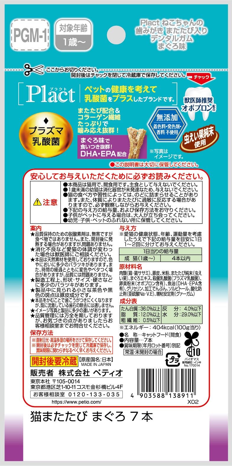 Plactはペットの健康を考えて乳酸菌をプラスしたブランドです。またたび入りのデンタルガムを噛むことで豚皮のコラーゲン繊維が歯垢をからめて落とします。まぐろ味で食いつき抜群!着色料・発色剤・香料無添加。