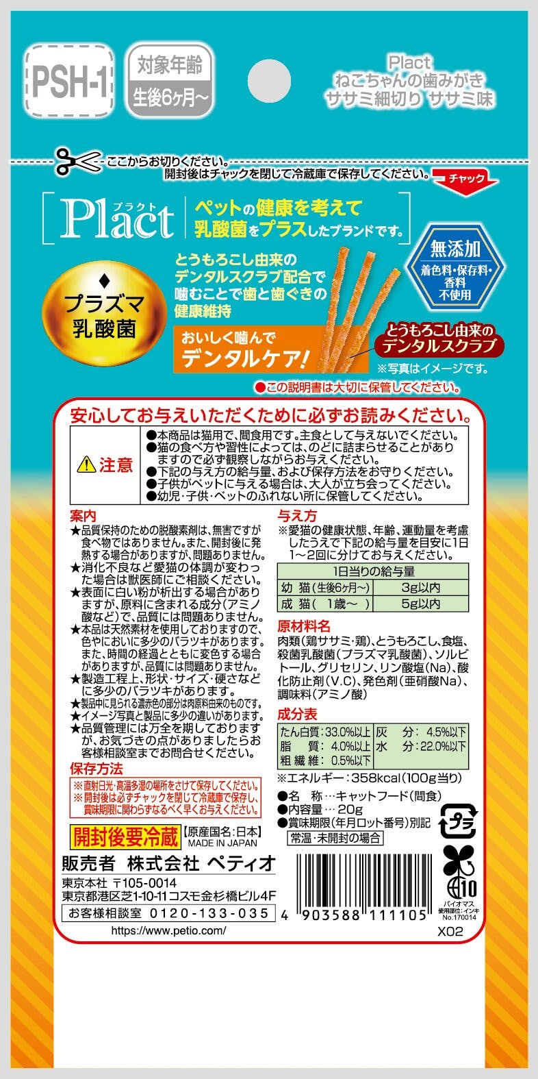 Plactはペットの健康を考えて乳酸菌をプラスしたブランドです。おいしく食べやすいササミの細切りにとうもろこし由来のデンタルスクラブを配合。毎日おいしく歯みがきができる!着色料・保存料・香料無添加。