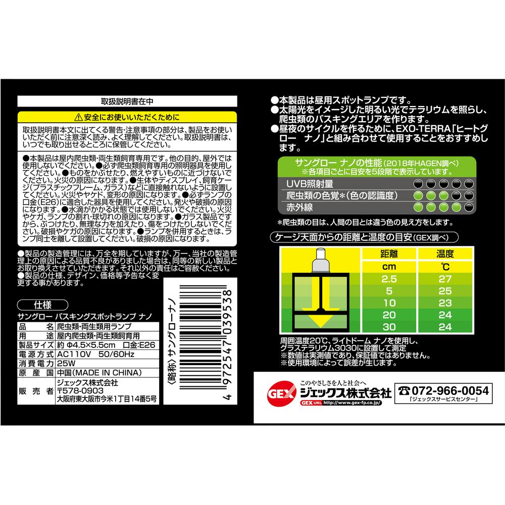 ●本製品は昼用スポットランプです。●太陽光をイメージした明るい光でテラリウムを照らし、爬虫類のバスキングエリアを作ります。●昼夜のサイクルを作るために、EXO-TERRA「ヒートグロー ナノ」と組み合わせて使用することをおすすめします。
