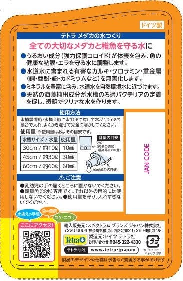 全ての大切なメダカと稚魚を守る、うるおい成分配合カルキ抜き入り粘膜保護剤●うるおい成分(強力保護コロイド)が体表を包み、魚の健康な粘膜●エラを守る水に調整●水道水に含まれる有害なカルキ・クロラミン・重金属(銅・亜鉛・鉛・カドミウムなど)を無害化します●ミネラルを豊富に含み、水道水を自然環境水に近づけます●天然の海藻抽出成分が水槽のろ過バクテリアの定着を促し、透明でクリアな水を作ります