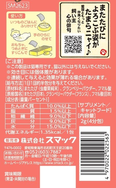 またたび(虫えい果純末)、クランベリーパウダー、フマル酸 日本