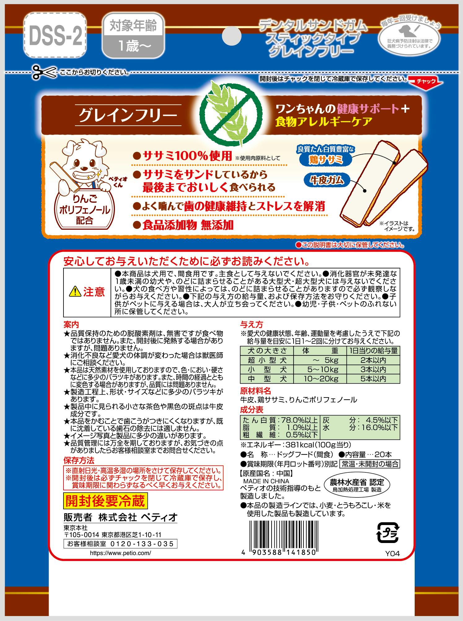 グレインフリーだからワンちゃんの健康サポート・食物アレルギーケアができる。ササミをサンドしているから最後までおいしく食べられる。よく噛んで歯の健康維持とストレスを解消。ササミ100%使用(使用肉原料として)。りんごポリフェノール配合。食品添加物無添加。農林水産省認定 鳥加熱処理工場製造。