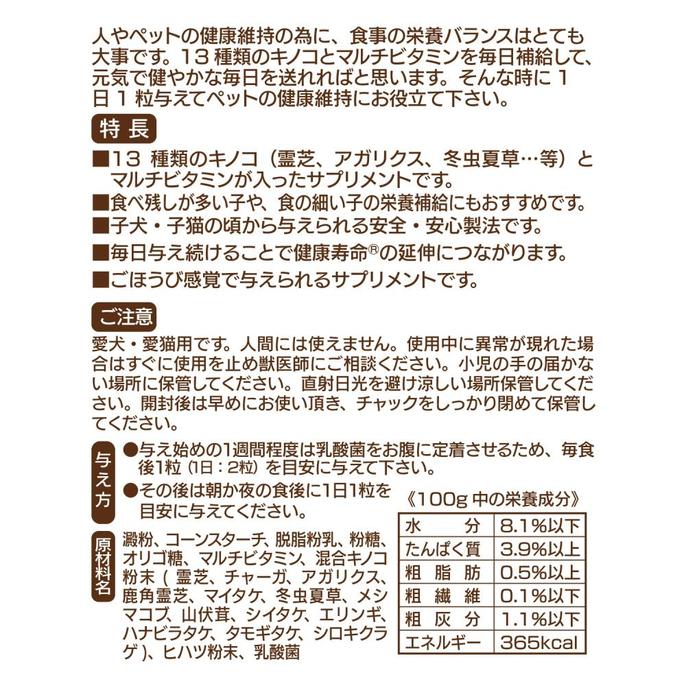 ●免疫とお腹の健康維持●13種類のキノコ(霊芝、アガリクス、冬虫夏草…等)とマルチビタミンが入ったサプリメントです。●食べ残しが多い子や、食の細い子の栄養補給にもおすすめです。●子犬・子猫の頃から与えられる安全・安心製法です。●毎日与え続けることで健康寿命の延伸につながります。●ごほうび感覚で与えられるサプリメントです●着色料・香料・保存料 無添加