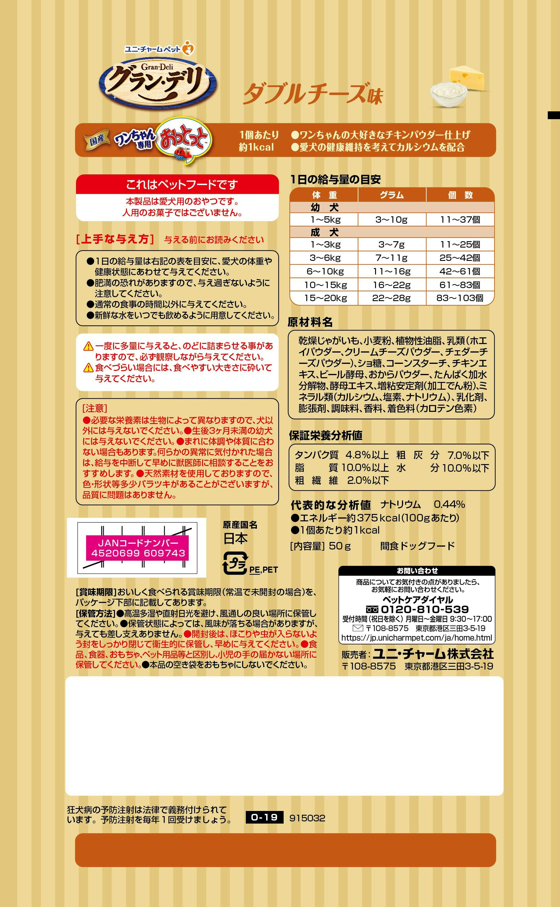 ユニ・チャーム グランデリ犬用おっとっとダブルチーズ50g 嗜好性 犬用 おやつ 3482297001【別送品】