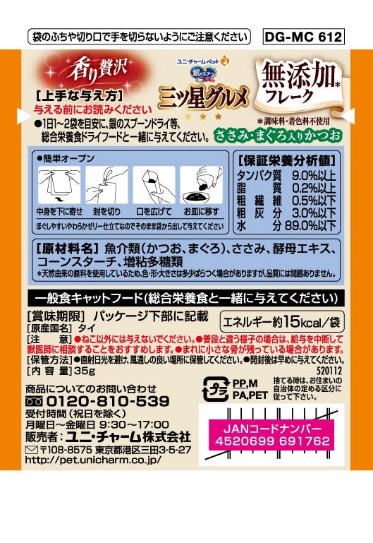 ユニ・チャーム 三ツ星Pフレーク無添加笹身鮪鰹35g 4520699691762 3482418001【別送品】