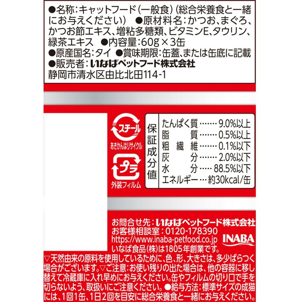 まぐろの細かめフレークをゼリーでコーティングしました。風味豊かなかつおだし仕立て。タウリン配合。着色料不使用。国産品。食べきりやすい60g×3缶パック。
