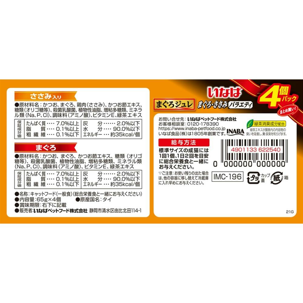 • いなば まぐろ ジュレ 乳酸菌 まぐろささみバラエティ 65g×4P 高嗜好性 ウェットフード 猫用 3753534001【別送品】