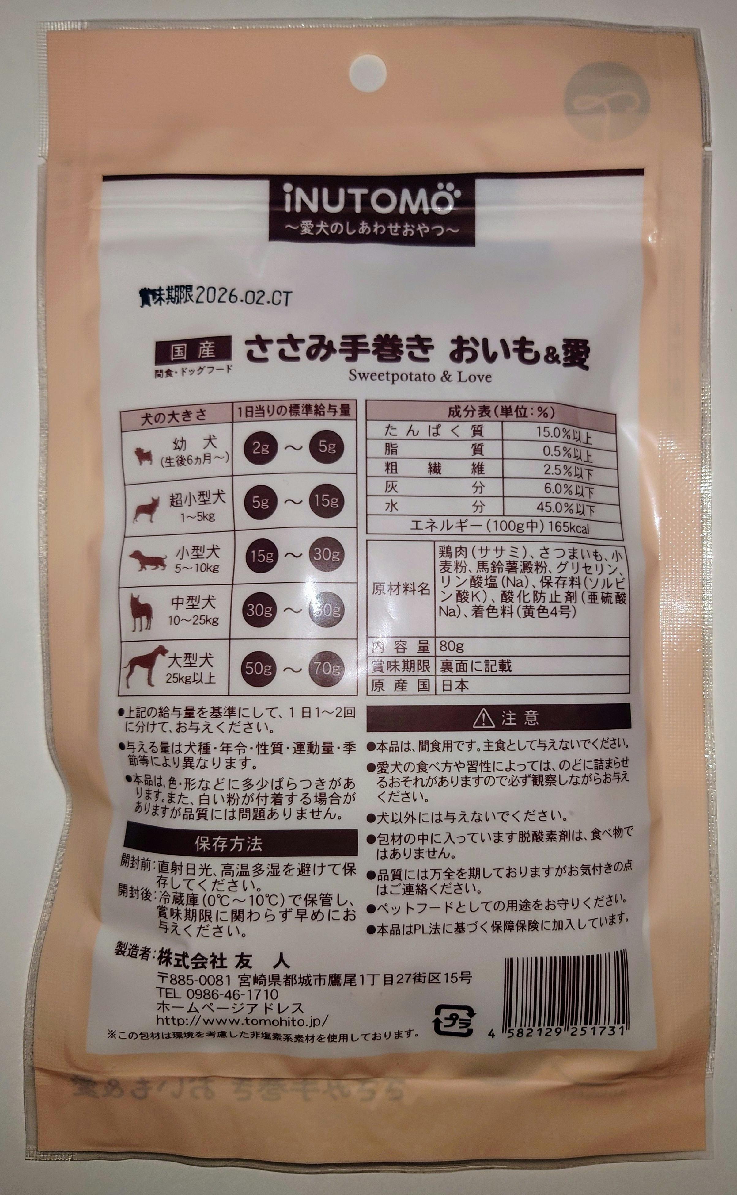 iNUTOMO 笹身手巻きお芋&愛80g ドッグフード ジャーキー 食物繊維 1340448001【別送品】