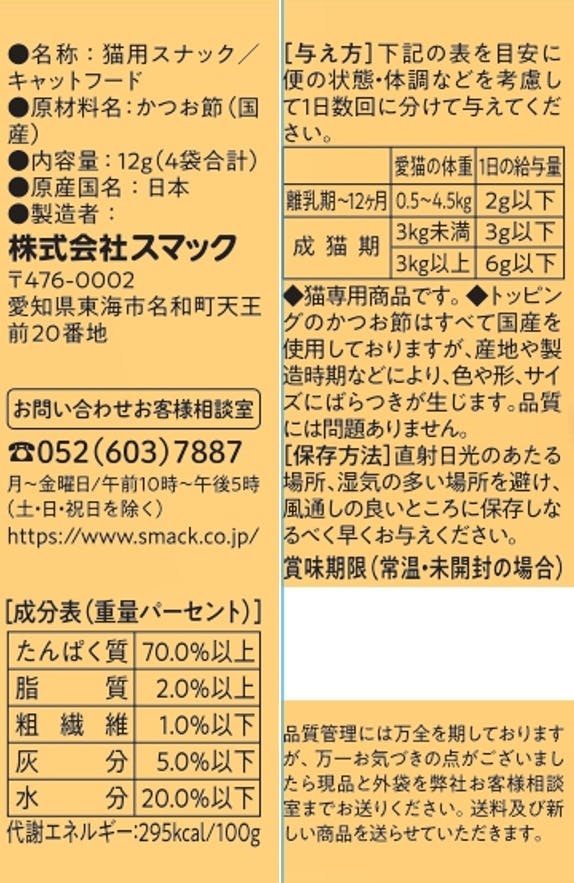 ●猫専用商品です。●トッピングのかつお節はすべて国産を使用しておりますが、産地や製造時期などにより、色や形、サイズにばらつきが生じます。品質には問題ありません。