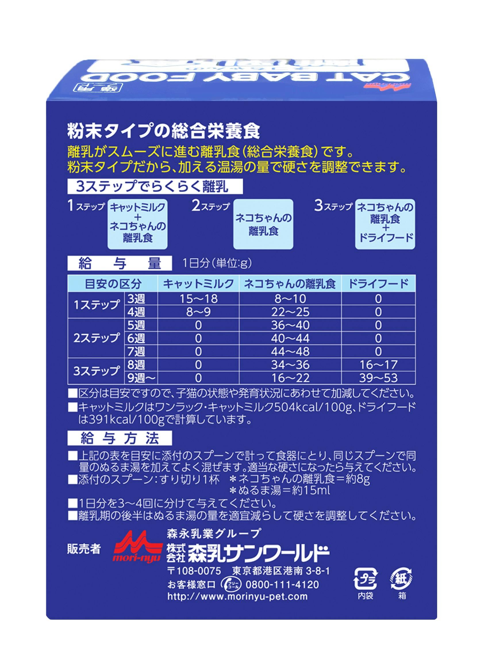 ●給与量表を目安に添付のスプーンで計って食器にとり、同じスプーンで同量のぬるま湯を加えてよく混ぜます。適当な硬さになったら与えてください。●添付のスプーンはすり切り1杯でネコちゃんの離乳食:約8g、ぬるま湯:約15mlです。●1日分を3~4回に分けて与えてください。●離乳期の後半はぬるま湯の量を適宜減らして硬さを調整してください。