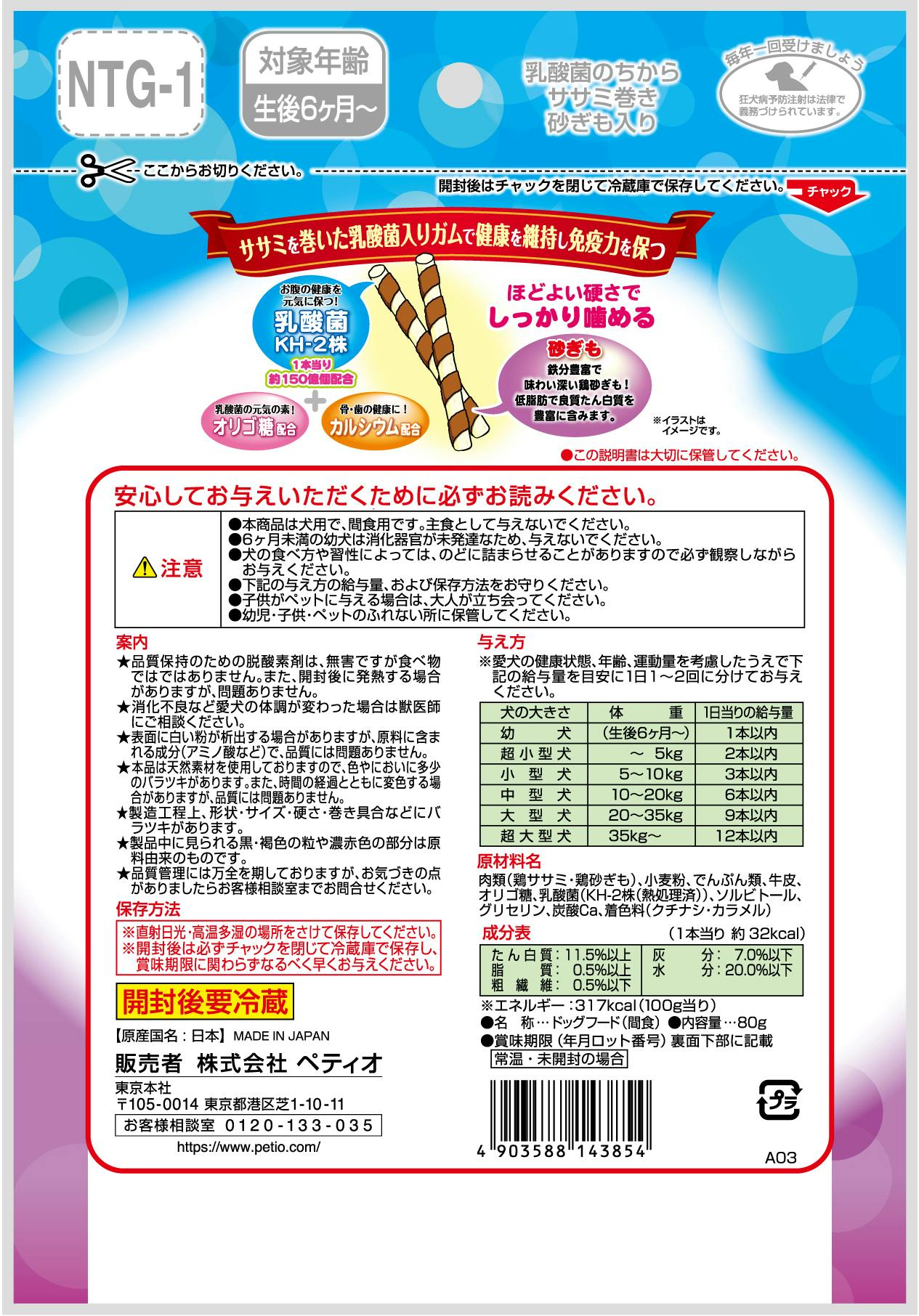 原材料:肉類(鶏ササミ・鶏砂ぎも)、小麦粉、でんぷん類、牛皮、オリゴ糖、乳酸菌(KH-2株(熱処理済))、ソルビトール、グリセリン、炭酸Ca、着色料(クチナシ・カラメル) 原産国:日本