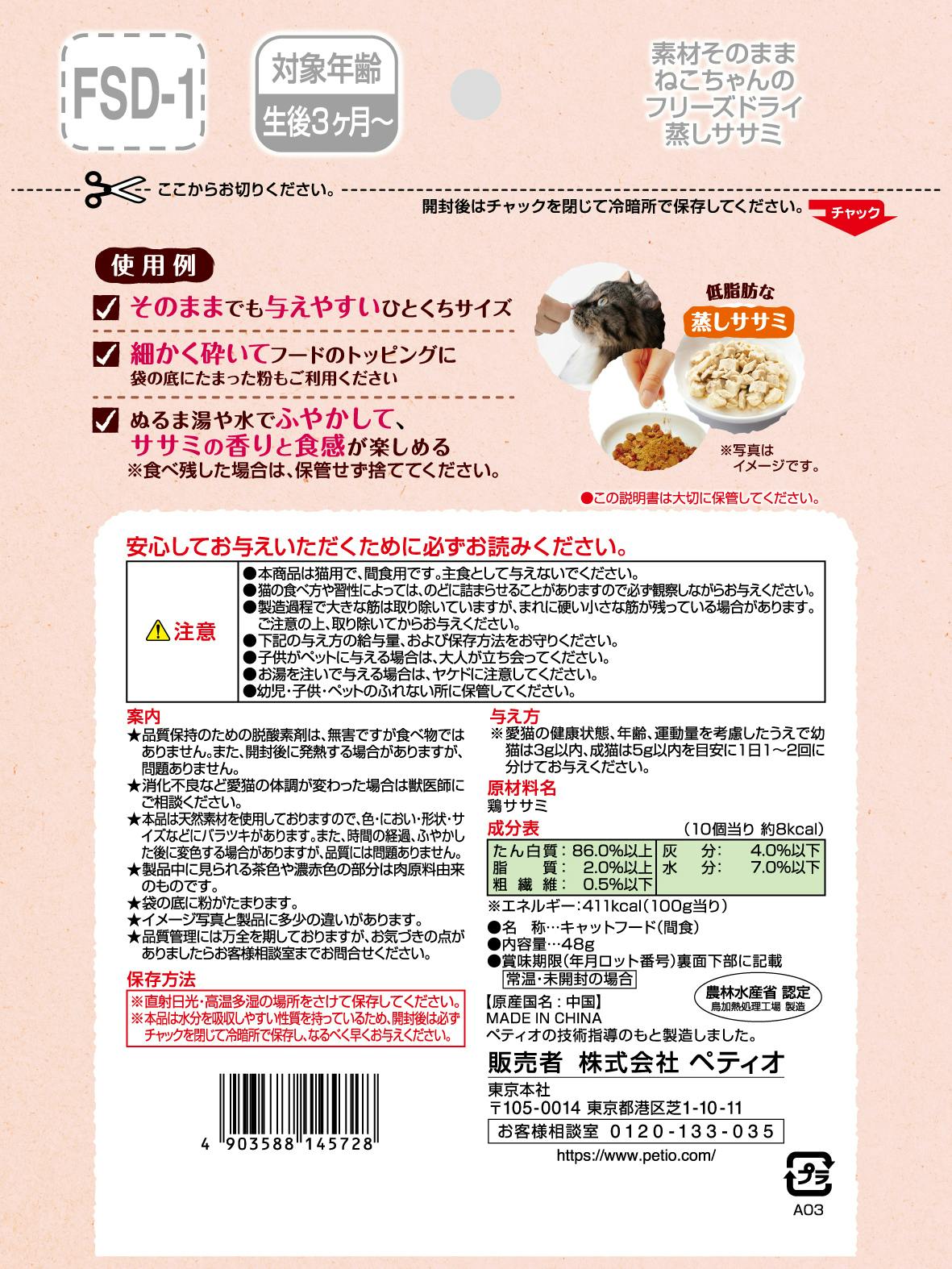 ペティオ ねこフリーズドライ蒸しササミ48g 猫用おやつ 無添加 ひとくちサイズ 3419383001【別送品】