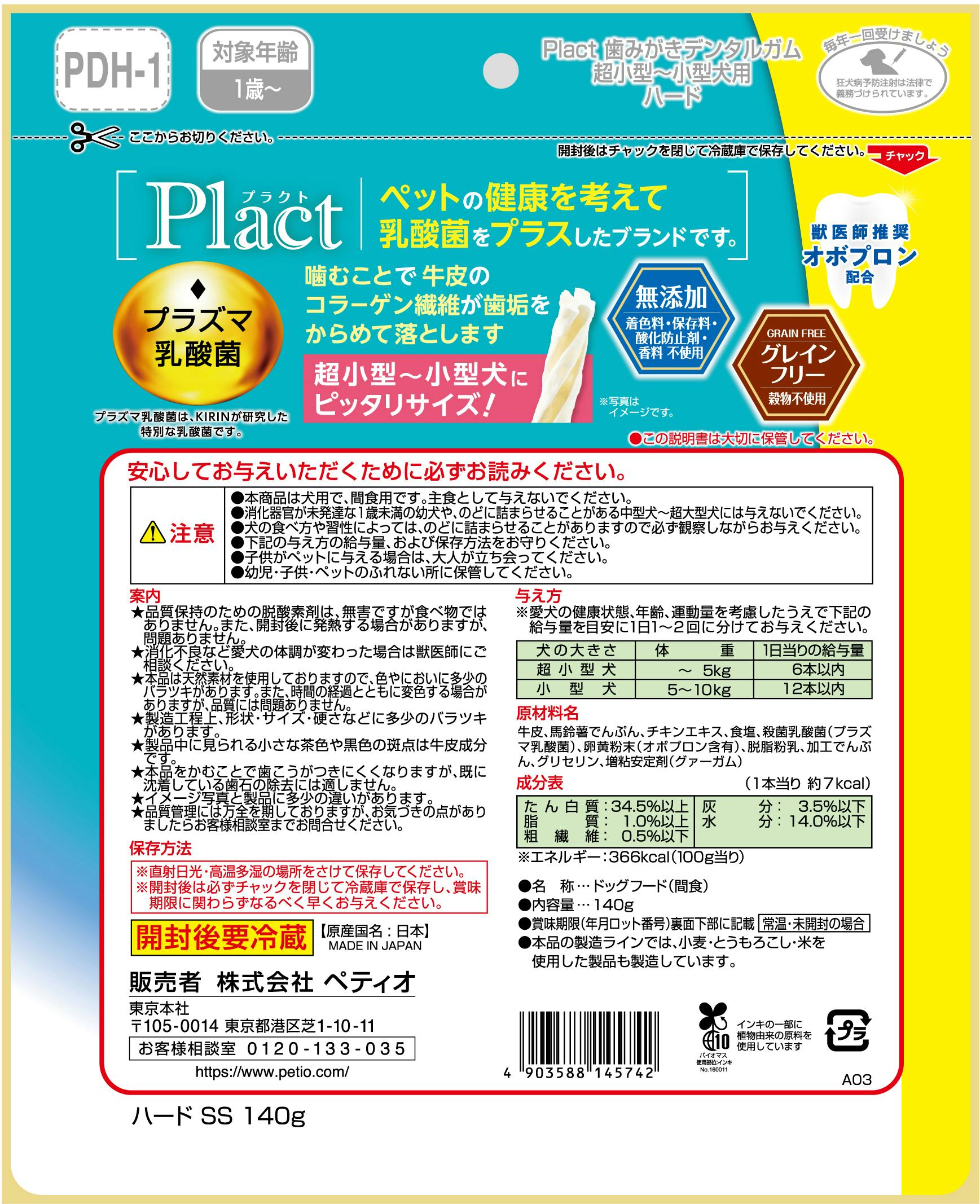Plactはペットの健康を考えて乳酸菌をプラスしたブランドです。噛むことで牛皮のコラーゲン繊維が汚れをからめて落とします。超小型犬~小型犬にピッタリサイズ!グレインフリーだからワンちゃんの健康サポート・食物アレルギーケアができる。獣医師推奨オボプロン配合。着色料・保存料・酸化防止剤・香料無添加。お買い得なお徳用大容量パック。