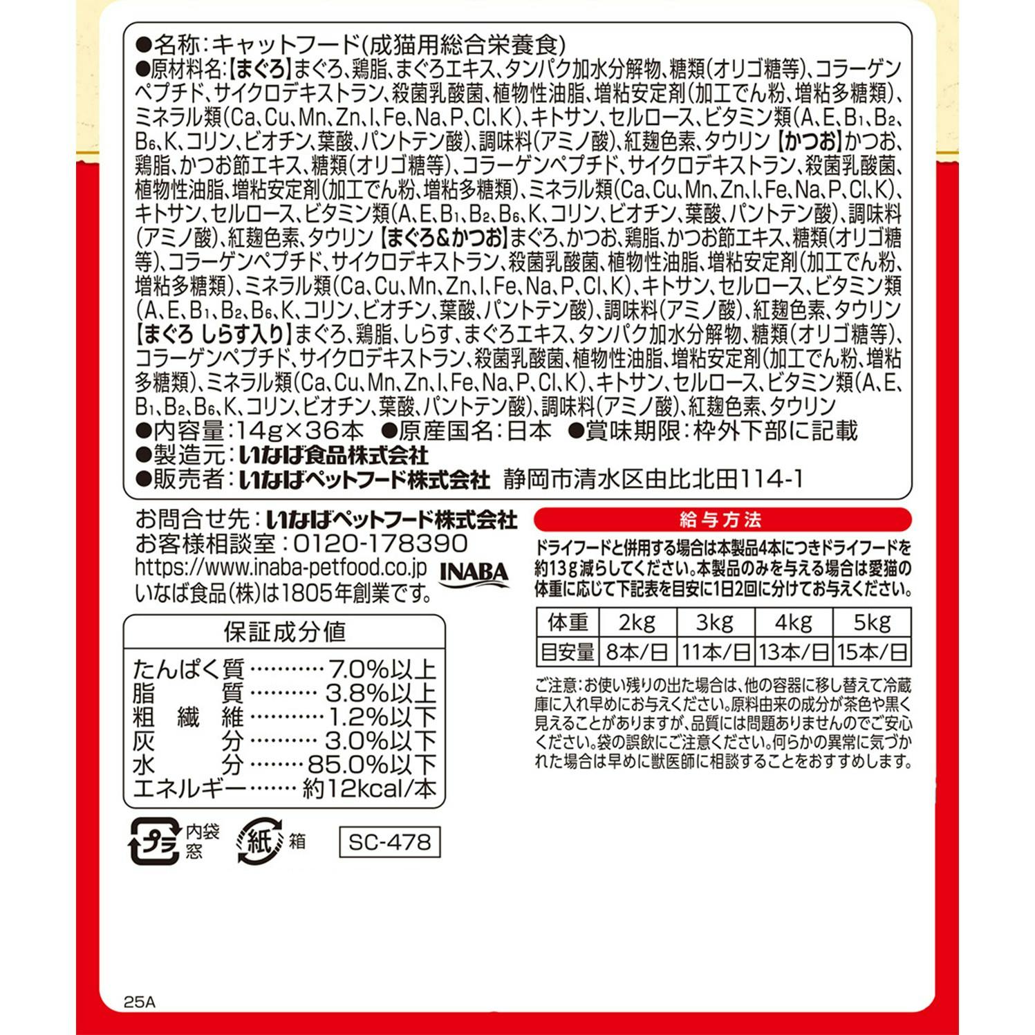 【まぐろ しらす入り】まぐろ、鶏脂、しらす、まぐろエキス、タンパク加水分解物、糖類、コラーゲンペプチド、殺菌乳酸菌、サイクロデキストラン、植物性油脂、増粘安定剤、ミネラル類、キトサン、セルロース、ビタミン類、調味料、紅麹色素、タウリン