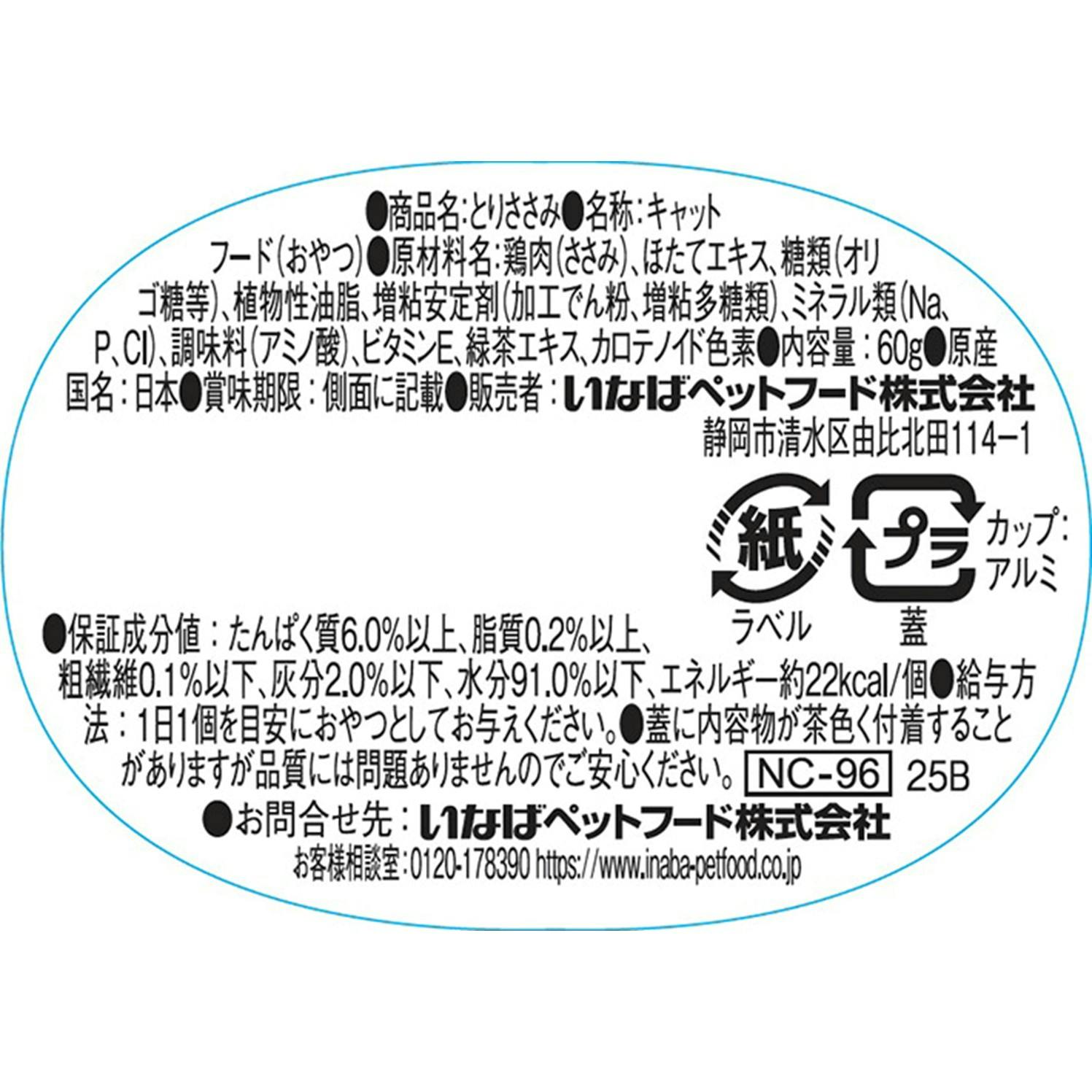 原材料:鶏肉(ささみ)、ほたてエキス、糖類(オリゴ糖等)、植物性油脂、増粘安定剤(加工でん粉、増粘多糖類)、ミネラル 類(Na、P、Cl)、調味料(アミノ酸)、ビタミンE、緑茶エキス、カロテノイド色素 原産国:日本