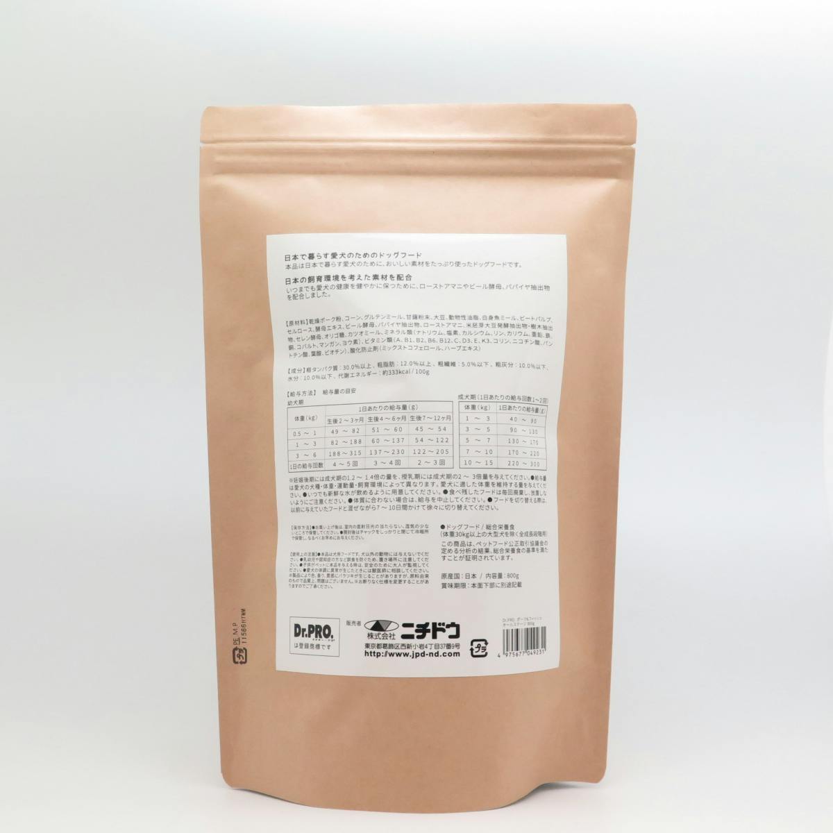 乾燥ポーク粉、コーン、グルテンミール、甘藷粉末、大豆、動物性油脂、白身魚ミール、ビートパルプ、セルロース、酵母エキス、ビール酵母、パパイヤ抽出物、ローストアマニ、米胚芽大豆発酵抽出物・樹木抽出物、セレン酵母、オリゴ糖、カツオミール、ミネラル類、ビタミン類、酸化防止剤 原産国:日本