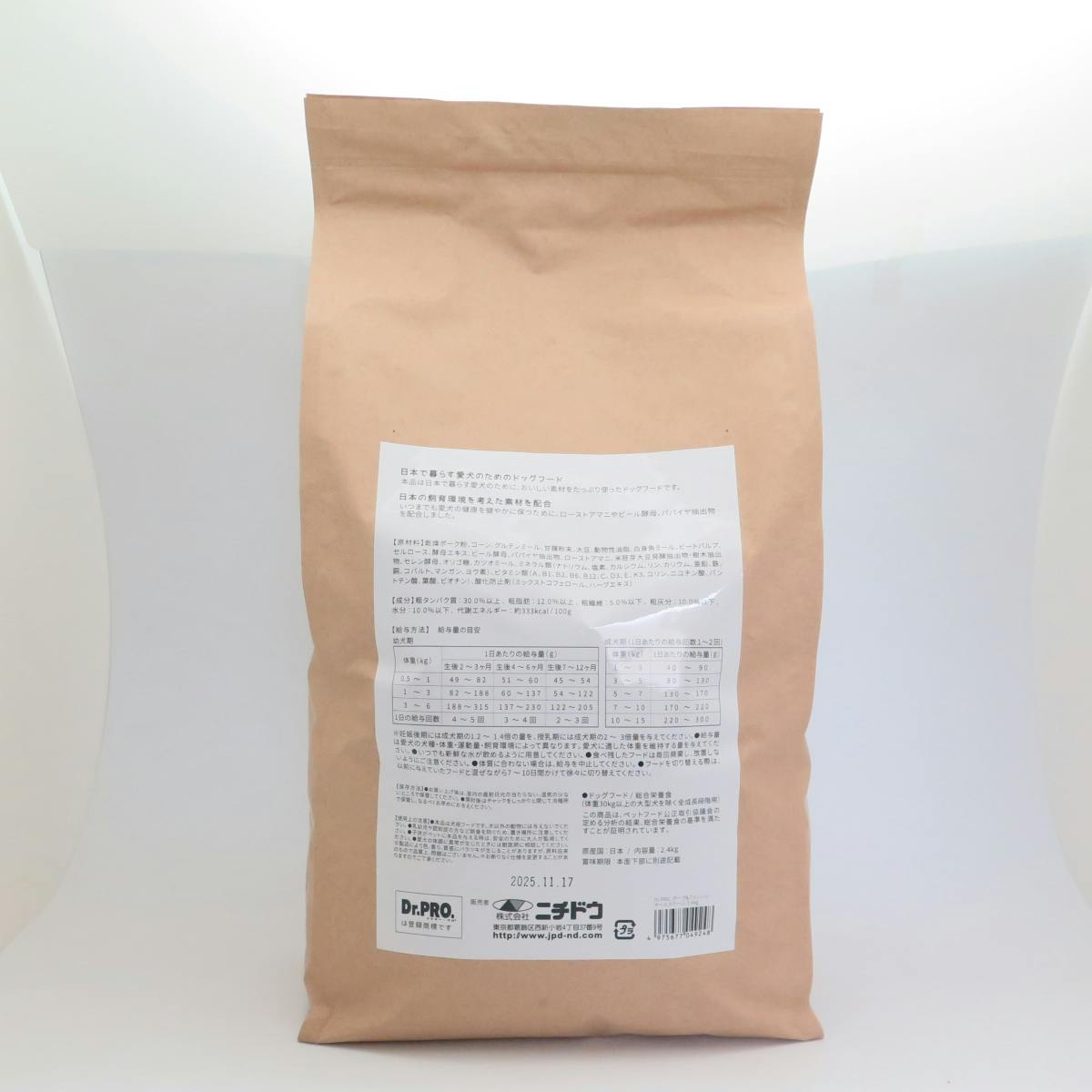 ●給与量は愛犬の犬種・体重・運動量・飼育環境によって異なります。愛犬に適した体重を維持する量を与えてください。●いつでも新鮮な水が飲めるように用意してください。●食べ残したフードは毎回廃棄し、放置しないようにご注意ください。●体質に合わない場合は、給与を中止してください。●フードを切り替える際は、以前に与えていたフードと混ぜながら7~10日間かけて徐々に切り替えてください。