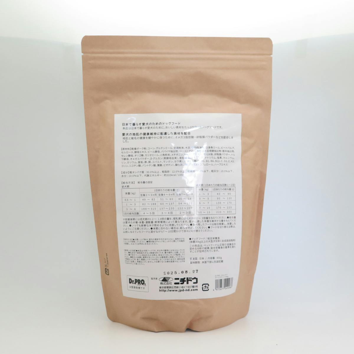 乾燥ポーク粉、コーン、グルテンミール、甘藷粉末、大豆、動物性油脂、白身魚ミール、ビートパルプ、セルロース、酵母エキス、ビール酵母、パパイヤ抽出物、ローストアマニ、米胚芽大豆発酵抽出物・樹木抽出物、セレン酵母、オリゴ糖、カツオミール、小魚粉末、メチオニン、キャノーラオイル、還元水飴、卵殼膜パウダー、トルラ酵母、オメガ3パウダー、βーグルカン、亜鉛酵母、ミネラル類、ビタミン類、酸化防止剤 原産国:日本