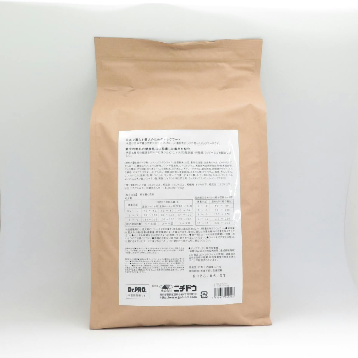 乾燥ポーク粉、コーン、グルテンミール、甘藷粉末、大豆、動物性油脂、白身魚ミール、ビートパルプ、セルロース、酵母エキス、ビール酵母、パパイヤ抽出物、ローストアマニ、米胚芽大豆発酵抽出物・樹木抽出物、セレン酵母、オリゴ糖、カツオミール、小魚粉末、メチオニン、キャノーラオイル、還元水飴、卵殼膜パウダー、トルラ酵母、オメガ3パウダー、βーグルカン、亜鉛酵母、ミネラル類、ビタミン類、酸化防止剤 原産国:日本
