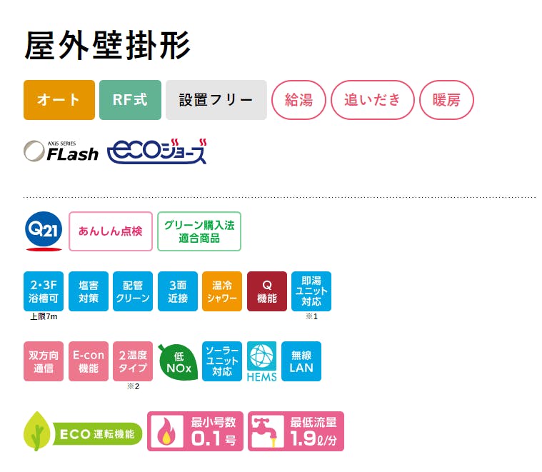 ●オート●RF式●設置フリー●給湯●追いだき●暖房●ハーモニーシリーズ●エコジョーズ●Q21●あんしん点検●グリーン購入法適合商品●2・3F浴槽可●塩害対策●配管クリーン●3面接近●温冷シャワー●Q機能●即湯ユニット対応●双方向通信●E-con機能●2温度タイプ●低Nox●ソーラーユニット対応●HEMS●無線LAN●ECO運転機能●最小号数0.1号●最低流量1.9L/分