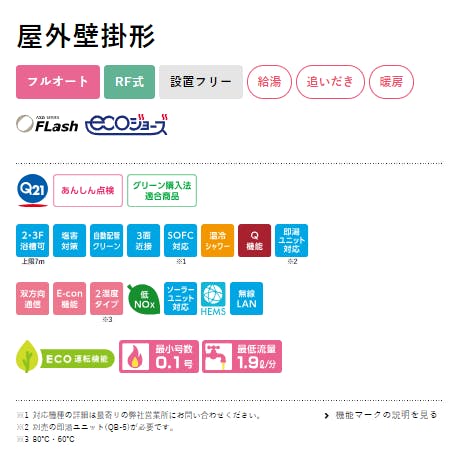 ●フルオート●RF式●設置フリー●●暖房●ハーモニーシリーズ●エコジョーズ●Q21●あんしん点検●グリーン購入法適合商品●2・3F浴槽可(上限7m)●塩害対策●配管クリーン●3面接近●SOFC対応●温冷シャワー●Q機能●即湯ユニット対応●双方向通信●E-con機能●2温度タイプ●低Nox●ソーラーユニット対応●HEMS●無線LAN●ECO運転機能●最小号数0.1号●最低流量1.9L/分