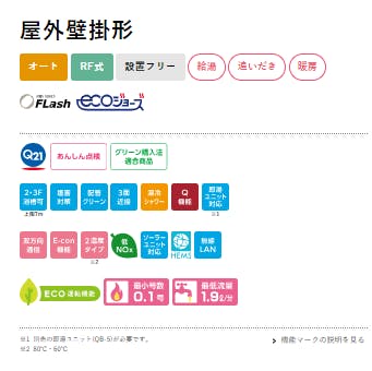 ●オート●RF式●設置フリー●給湯●追いだき●暖房●ハーモニーシリーズ●エコジョーズ●Q21●あんしん点検●グリーン購入法適合商品●2・3F浴槽可●塩害対策●配管クリーン●3面接近●温冷シャワー●Q機能●即湯ユニット対応●双方向通信●E-con機能●2温度タイプ●低Nox●ソーラーユニット対応●HEMS●無線LAN●ECO運転機能●最小号数0.1号●最低流量1.9L/分