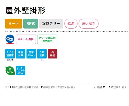 ●オート●RF式●設置フリー●給湯●追い炊き●Q21●あんしん点検●グリーン購入法適合商品●2・3F浴槽可●塩害対策●配管クリーン●3面接近●Q機能●低Nox●ソーラーユニット対応