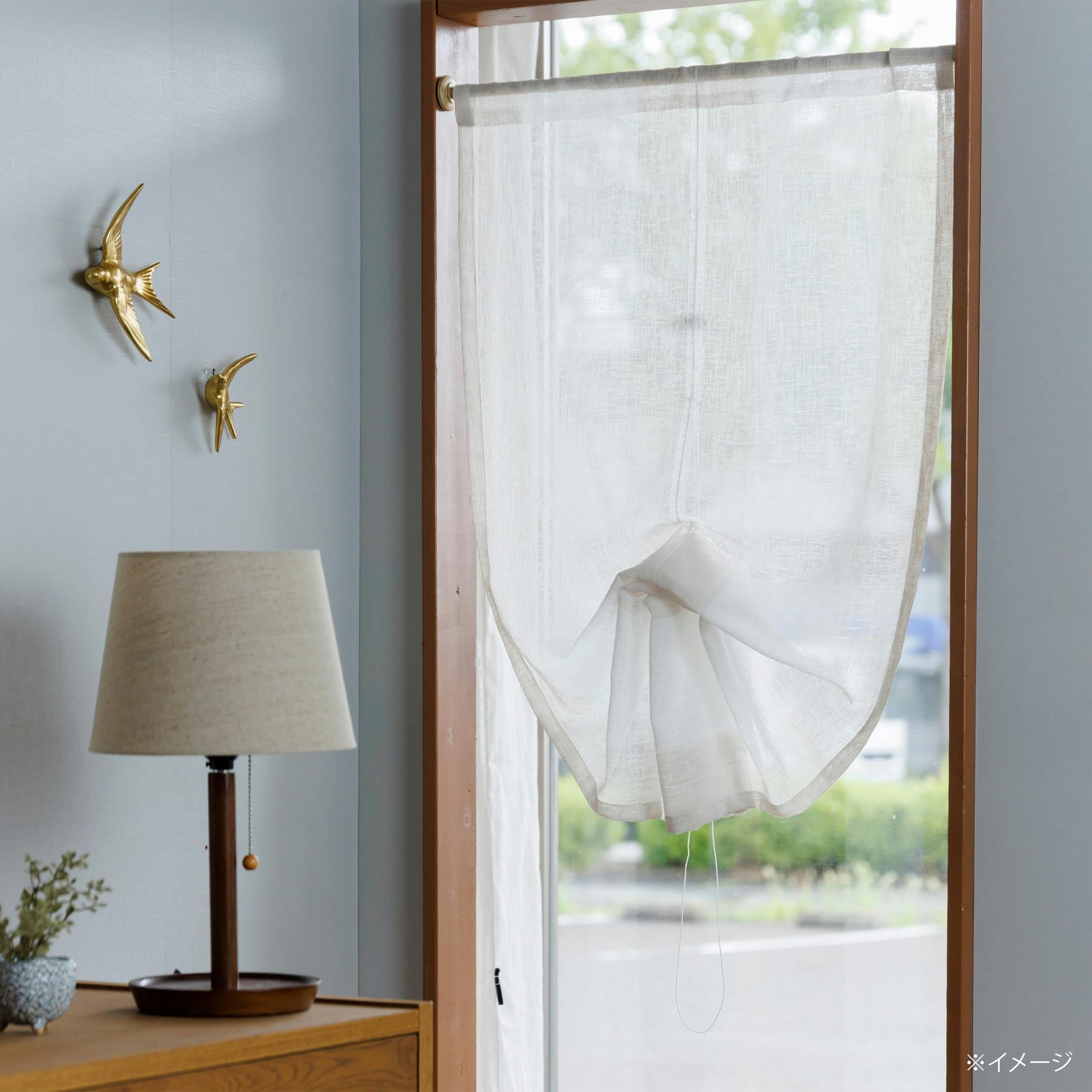 製品は絞った際にボトム部分がくじゃく(ピーコック)が羽を広げた状態のように見えるスタイルを採用。シンプルな麻長生地を使用し周りをフリルで彩ることで少しエレガンスさを表現したものとなっています。少しお部屋をエレガンスに飾りたい方へお勧めです。