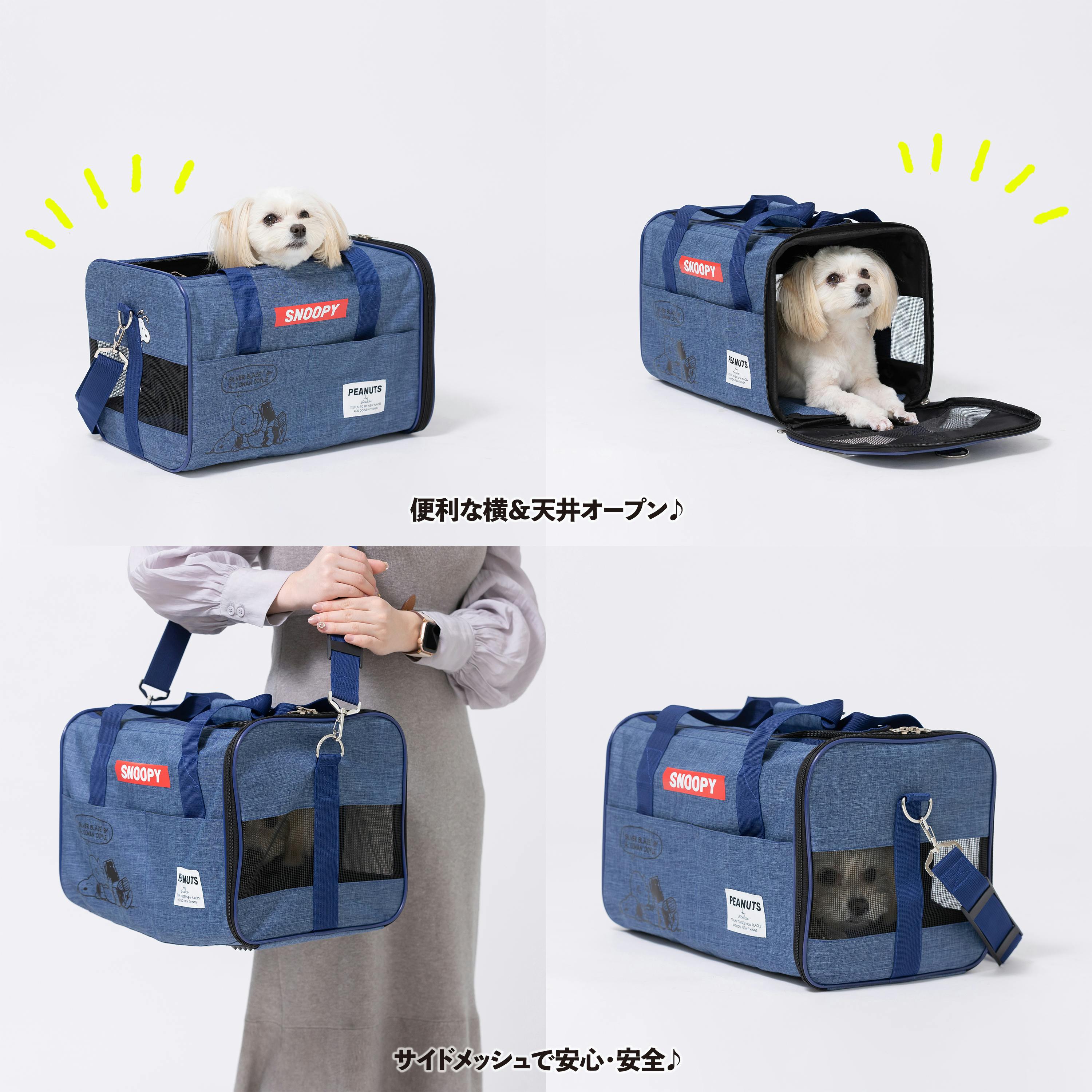 取り外し可能なショルダーベルトで斜め掛け・肩掛けで移動の際、両手を自由にできます。四隅が補強されているので自立し、ペットハウスとしても使用できます。側面と上部に入口があり、どちらからでも出し入れできます。全部閉めてもサイドがメッシュ仕様になっており通気性を確保しています。底面にはゴム足(底鋲)があり、設置面の汚れ擦れを防止します。耐荷重6KG(推奨体重3KG)