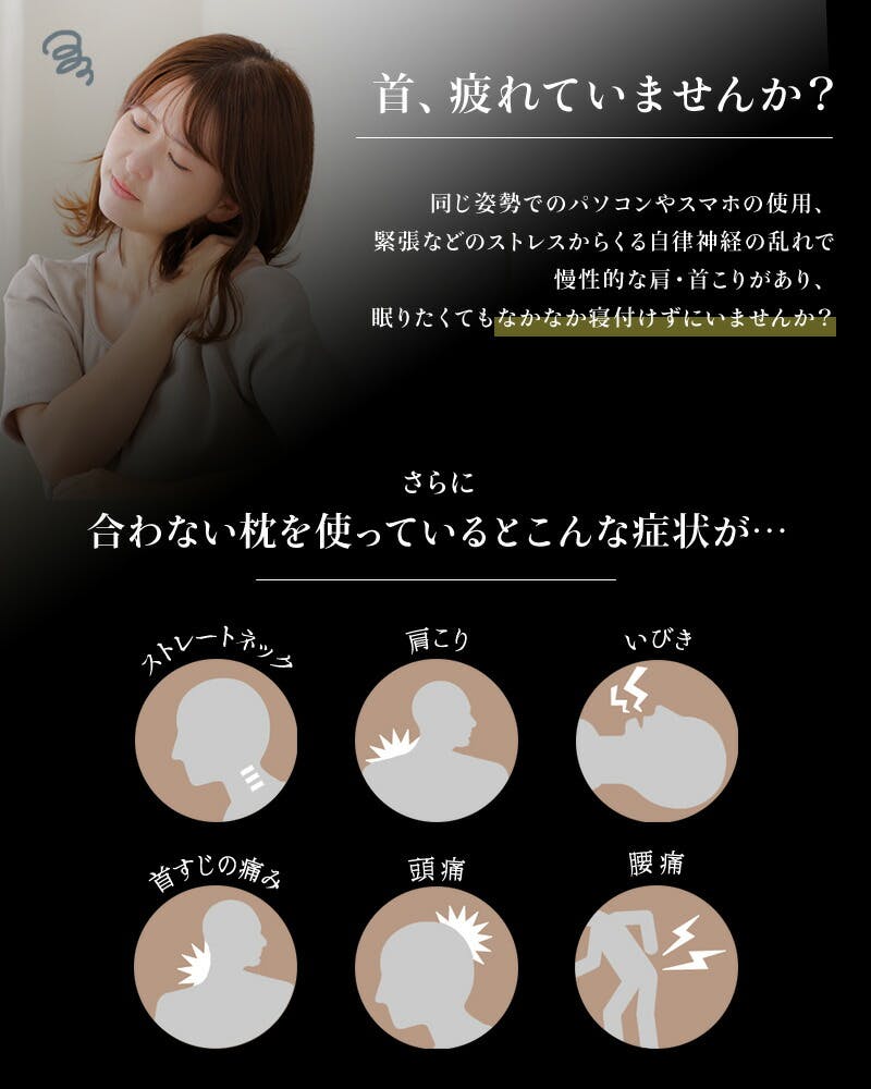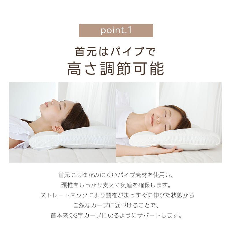 首元はパイプで高さ調節可能。首元にはゆがみにくいパイプ素材を使用、頸椎をしっかり支えて気道を確保。ストレートネックにより頸椎がまっすぐに伸びた状態から自然なカーブに近づけることで、首本来のS字カーブに戻るようにサポート。