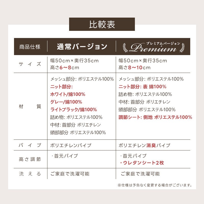 ◆生地:綿100% メッシュ部分:ポリエステル100% 中材:頭部分:ポリエステル100% 首部分:パイプ/ポリエチレン プレミアムバージョン:パイプ(竹炭入り消臭機能)プレミアムバージョン:高さ調整シート2枚付き◆原産国:中国