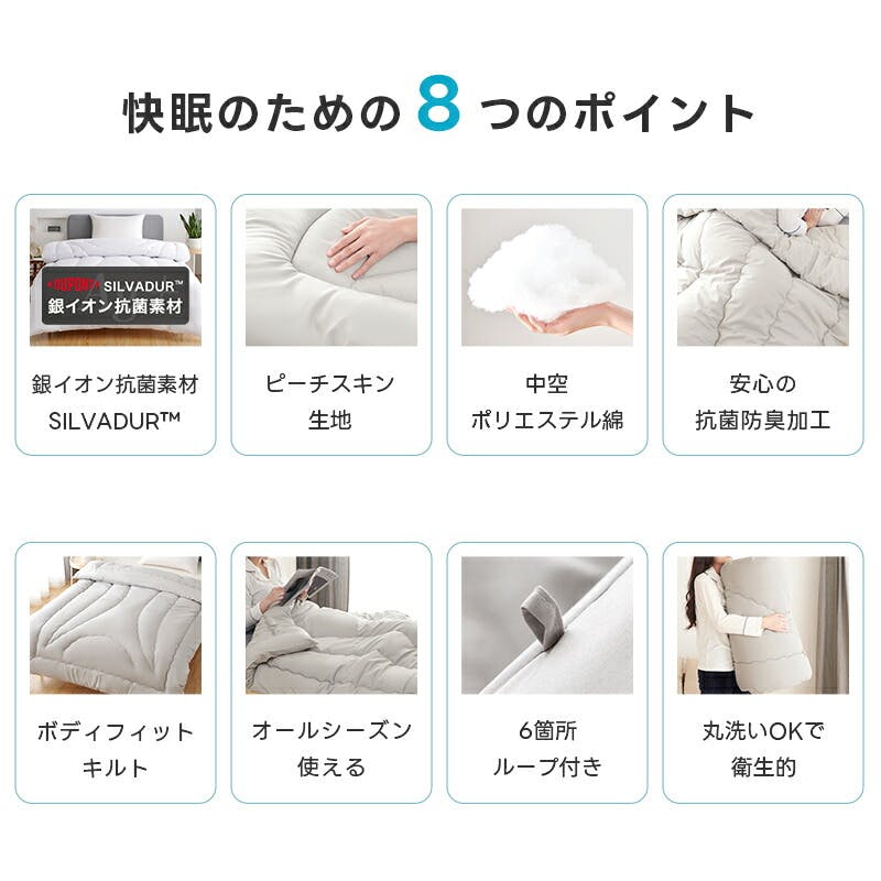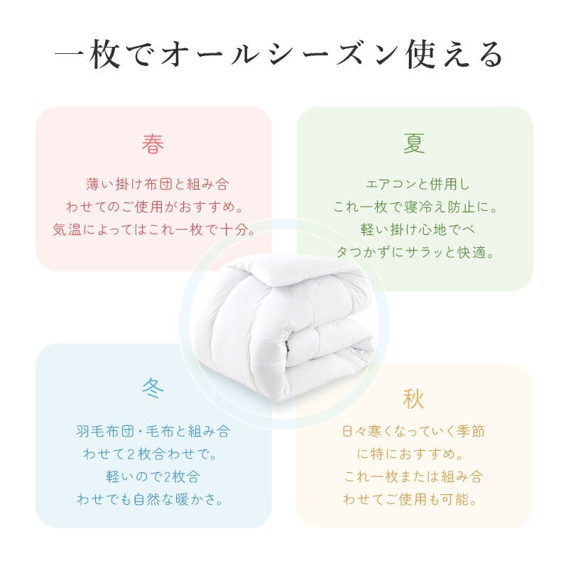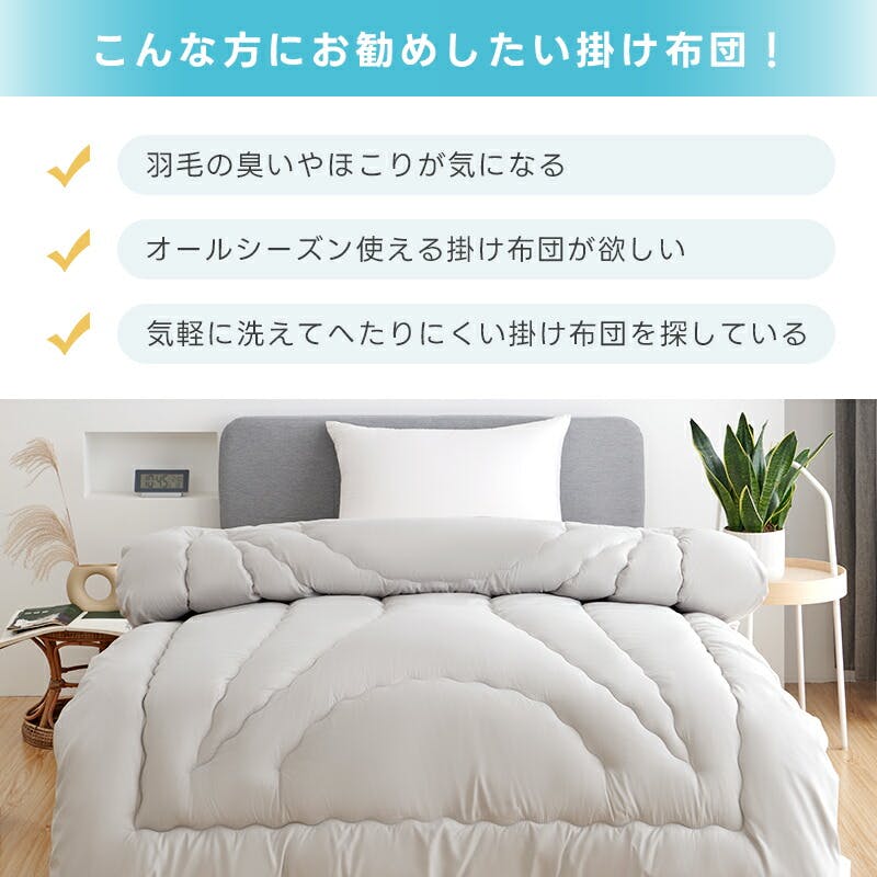 抗菌防臭・抗ウィルス素材の曲線キルティング加工の掛け布団。オールシーズン使え、ご家庭でも気軽に洗濯可能。いつでも清潔にご使用いただけます。