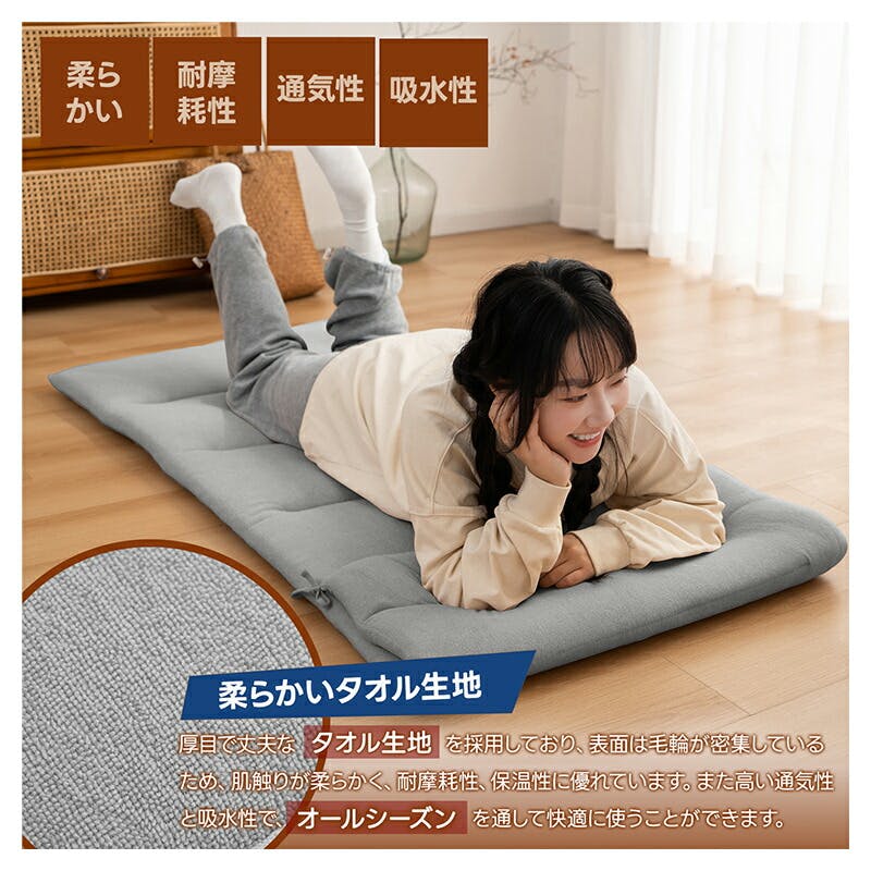 固綿入りの三層構造で高い弾力性と耐久性。6つ折り可能&収納帯付きで簡単収納可能。ごろ寝マット・長座布団として、キャンプや車中泊と大活躍です。