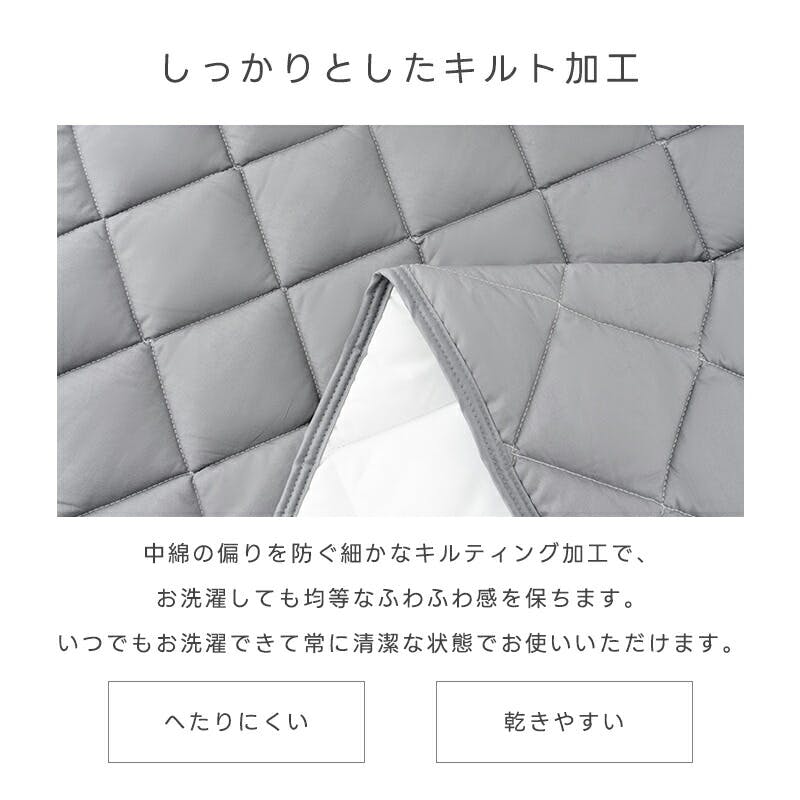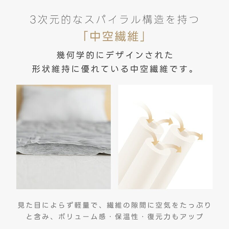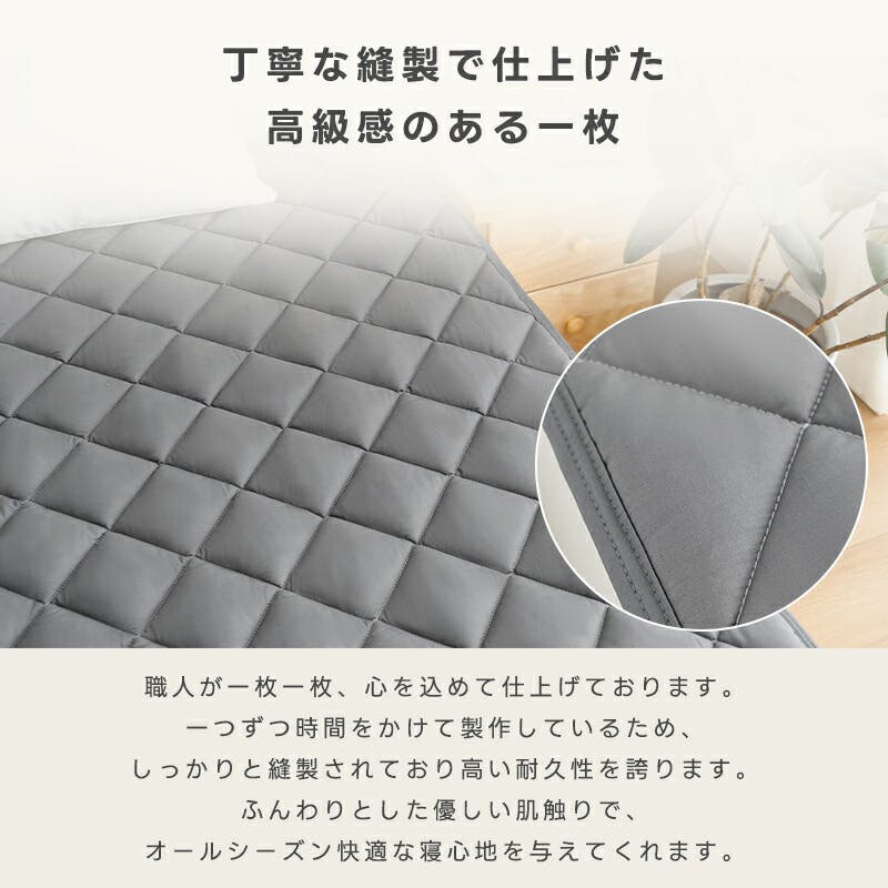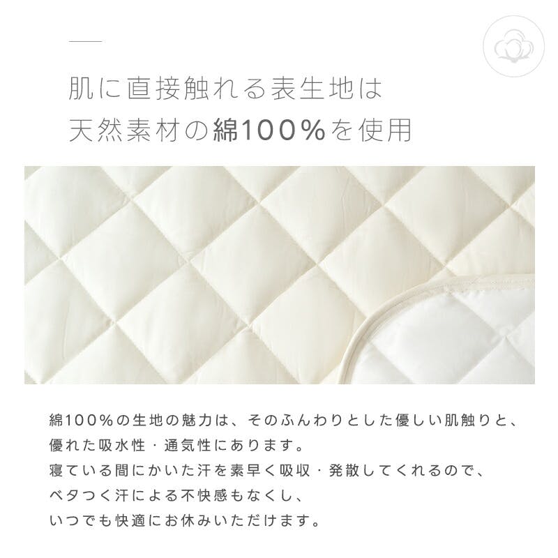 生地は天然素材の綿100%素材。防カビの抗菌防臭加工。通気性、保温性に優れ、夏はサラッと、冬はふんわりとした心地よさで質の良い眠りを実現!